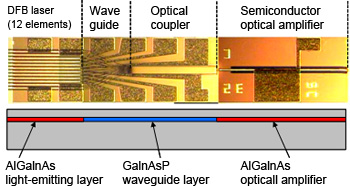(note 4)AlGaInAs - This material makes it possible to create lasers that control the lowering of output even at high temperatures, compared to the conventional GaInAsP. As it contains Al which is oxidized readily, it is generally considered difficult to apply AlGaInAs to integrated-type optical elements that are produced through complicated processes.