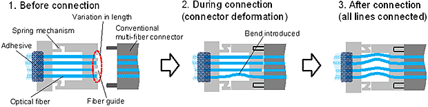 With existing multi-fiber connectors, the fibers need to be fixed into the connector and then have their fiber-end faces precisely polished so that their tips align flat for low-loss connections. However, as the polishing process needs to be performed for each connector, the overall cost is high. The problem has been the lack of having a simple optical connector that offers the benefits of low signal loss without requiring costly polishing.