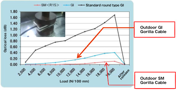 Okano Cable Co., Ltd. (main office: 1-5-28 Fukami-nishi, Yamato, Kanagawa Prefecture, Yamato, Fukaminishi 1-5-28,, President: Yasuhiro Kamikura, "Okano Cable" below), a member of the Furukawa Electric Group, has developed a new lateral pressure-resistant optical fiber cable for use outdoors that offers low increase of optical loss (Okano Cable comparison) even when lateral pressure is applied, and is lightweight and highly flexible ("Outdoor Gorilla Cable" below). Okano Cable began selling the product in October of this year. Sales of five million yen per month are expected in the second half of this fiscal year.