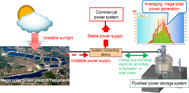 Basic performance of this machine will be tested and adjusted in confirmation tests and moved to a megawatt-class solar power plant at Komekurayama in Yamanashi Prefecture. There, it will be connected to the solar power system and the power grid of Tokyo Electric Power Company, and confirmation testing will be started to help stabilize fluctuating supply of renewable energy.