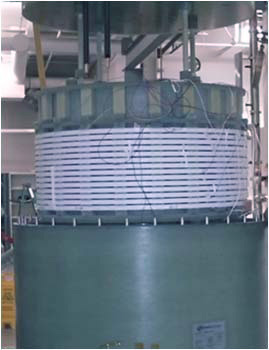 SuperPower has successfully completed the initial ac loss testing of a prototype Fault Current Limiter (FCL) Transformer HV winding module being developed in its FCL Transformer program sponsored by the US Department of Energy(Note 1). The HV winding module was tested in SuperPower’s new calorimetric ac loss coil test facility. The ac loss coil test apparatus was developed to determine the ac losses developed in prototype winding modules and to enable the ability to look at the impact on ac losses of different winding configurations and 2G HTS conductor architectures. The calorimetric ac loss measurement system is LN2 based and can handle coils up to 850 mm diameter and 600 mm height and losses from a few watts to up to 1500W.