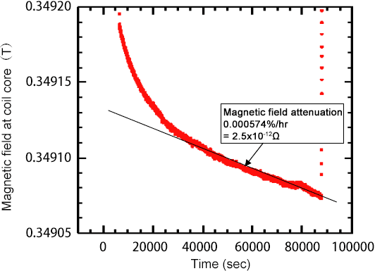Furukawa Electric has produced a test superconducting coil and a persistent current switch using the rare earth HTS wire materials of SuperPower Inc., a subsidiary of Furukawa Electric in the U.S., and connected them with superconductors to manufacture a superconducting coil device. At Tohoku University, researchers cooled this superconducting coil device to 20 K (minus 250℃) using a compact refrigerating machine before applying a 100 A current from a power source with the persistent current switch in the open position to generate a magnetic field of 3,500 Gauss. They then closed the persistent current switch to isolate the device from the external power source and verified that a current of 100 A flowed for more than 24 hours. When magnetic field attenuation had stabilized, they verified from 10 hours of magnetic field attenuation measurements that the superconducting connection had a of 10-12 Ω connection resistance.