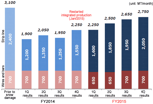 Although copper strip product production results fell to around 60% of production prior to the snow damage that occurred in February 2014, production has continued to improve favorably since integrated production was restarted in January 2015. Furukawa Electric was able to reach a monthly production of 2,750 tons during the 4th quarter of the FY2015 (89% of the rate of production prior to the snow damage), and also achieved its yearly production plan for the FY2015.