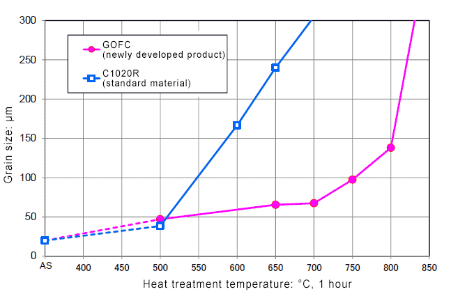 Furukawa Electric has developed technology to mass produce "GOFC" (Grain Growth Control Oxygen-free Copper) oxygen-free copper strips. Based on standard oxygen-free copper strips (C1020R), Furukawa Electric applied proprietary structure control technology without altering compositional standards to make it more difficult for grain coarsening to occur.
