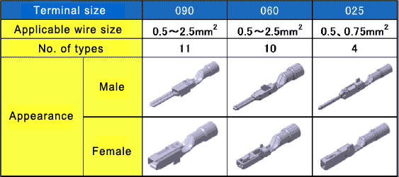 FAS has successfully developed the α Terminal Series of corrosion-proof terminals, which offer world-leading anti-corrosive performance and reduced anti-corrosion treatment costs, and can be used with existing connector housings. FAS has been mass producing 090 size(note 2) terminals (tab width of 2.3 mm; applicable wire range of 0.75 mm2 to 2.5 mm2; eight types in total) since August 2015.