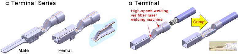 In addition to expanding the use of α Terminal Series from four-wheeled vehicle to two-wheeled vehicles, Furukawa Automotive Systems will use this opportunity to begin selling α Terminal Series (which previously had been used only on Furukawa Automotive Systems W/H) to other companies in the W/H industry and connector manufacturers inside and outside Japan, to help spread the use of α Terminal Series throughout the world.