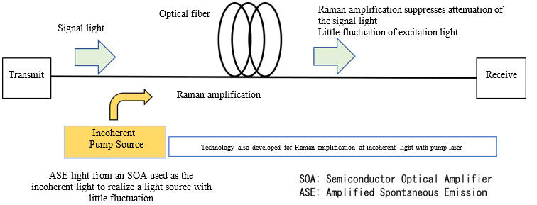 Furukawa Electric has developed new Pump Source technology for Raman amplification using incoherent light. The new Pump Source technology using incoherent light suppresses the effect of fluctuations in the pump light on the signal light. This makes it possible to realize co-propagating Raman amplification, the practical application of which has been difficult in the past. Co-propagating Raman amplification is an effective technology for the improvement of transmission characteristics and extension of transmission distance in optical fiber communications. This new development is expected to contribute greatly to the development of high-speed and large-capacity optical fiber communications systems, including for digital coherent optical transmission at 600 Gb/s and at over 1 Tb/s, which is being developed around the world in response to the expected rapid increase in traffic in the 5G era.