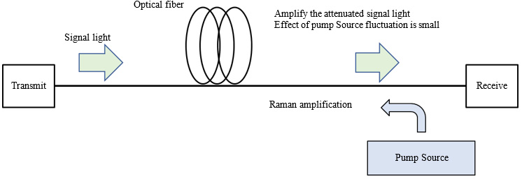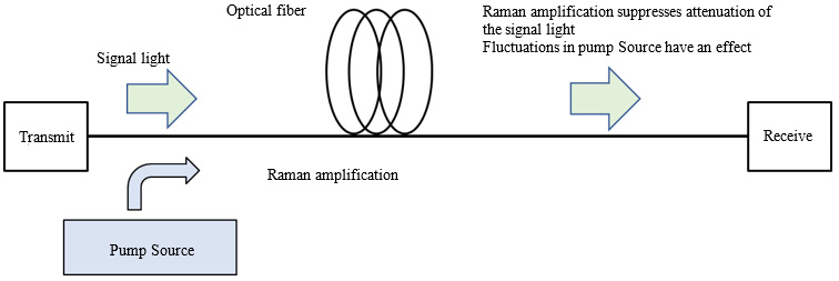 In Raman amplification, the fluctuation in the pump source can be transferred to the amplified optical signal, and this effect is maximum when the pump travels in the same direction as the signal (co-propagating) and minimum when the pump travels in the opposite direction (counter-propagating). Therefore counter-propagating Raman amplification, where the amplification is from the receiving side, is used as the standard method. In counter-propagating Raman amplification, the fluctuation of the pump light impressed on the signal light is averaged and the effect of it is reduced. However, there is a limit to the improvement of the transmission characteristics of the signal that has already propagated through the optical fiber. Co-propagating Raman amplification makes it possible to maximize the effect of Raman amplification, which further improves transmission characteristics. For this reason, it has long been hoped that new Pump Source technology would be developed to improve noise performance for co-propagating Raman amplification.