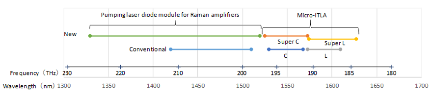 So far Furukawa Electric has commercialized micro-ITLAs and pump laser diode modules for Raman amplifiers for traditional C-band and L-band, and this time, we have extended its supporting wavelength range to Super C-band and Super L-band. These are also expected to be basic technologies that will support the future all-photonics network.