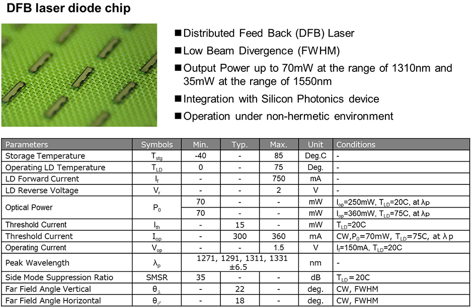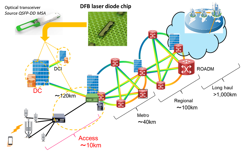 In data centers and access networks, intensity-modulated optical transceivers are used because of their small size and low power consumption. High-power and single-wavelength DFB laser diode chip is widely used in combination with silicon photonics technology there, which has been increasing popularity due to its advantages in compactness, high integration, low power consumption, and low cost. Demand for DFB laser diode chips for optical transceivers is expected to increase continuously for the future due to the adoption of silicon photonic transceivers in tandem with growth in communication traffic.