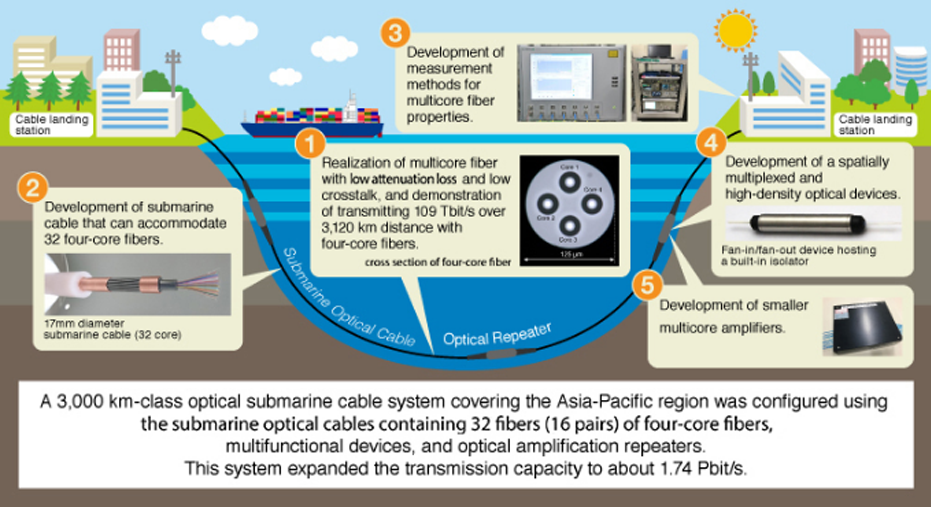 Multicore fibers are optical fibers with multiple light-propagating cores that exhibit higher transmission capacity than conventional optical fibers. This R&D project assessed the transmission capacity of a long-distance optical submarine cable system in the laboratory. We developed submarine optical cables using multicore fibers, compact multicore fiber optical amplifiers, and submarine optical cable performance assessment technology to establish the fundamental technologies needed to increase the capacity of the submarine optical cable system. We demonstrated the feasibility that the multicore fibers enhanced the transmission capacity of a 3,000 km class submarine optical cable system (covering the Asian-Pacific region) to about 1.7 Petabit per second (Pbit/s), seven-fold higher than the existing system(note 1).