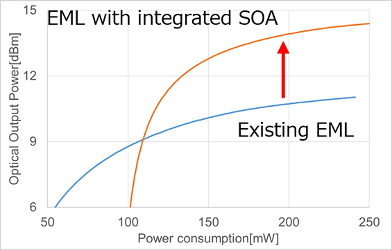 By integrating a SOA into the EML, this new product realizes approximately double the optical output power at the same power consumption level compared to existing EML. With the existing EML, optical output power is increased by increasing current flow to the laser, and as a result, power consumption increases in proportion to the increase in optical output power. By integrating a SOA that can increase optical output with high efficiency, the newly developed EML realizes both higher optical output power and low power consumption.
