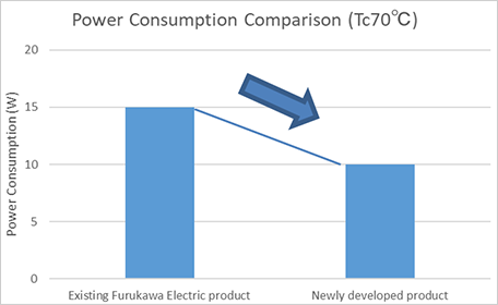 Concerning our FRL1441U Series pump laser for Raman amplifiers, in addition to the 700mW C-band pump laser developed last year, the new lineup will be expanded to include products for S-band and L-band applications. With consideration for the energy shift from short wavelength to long wavelength due to the impact of stimulated Raman scattering during optical transmission, we focused on high output power, low power consumption for S-band applications and lower power consumption design for L-band applications. The designs were optimized accordingly, and we developed pump lasers with 700mW output for S-band applications (Fig. 2) and 500mW output, low power consumption (33% lower compared to existing Furukawa Electric products, Fig. 3) for L-band applications. The higher output power and extended bandwidth were realized as a result of the high accuracy fiber coupling technology and optical semiconductor processing technology using InP (Note 2) semiconductor materials developed over the past 25 years, as well as the application of our unique low loss, high efficiency semiconductor laser device structure (Patented). Product samples will start being shipped from April, with mass production to commence from September.