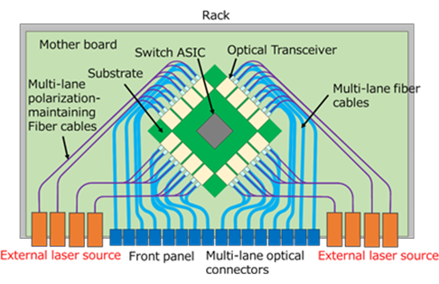 Data traffic has been increasing to support many kinds of IT services such as cloud services and 5G mobile networks. Hyperscale data centers that process big data and edge data centers that realize the low latency for Beyond 5G are faced with the challenge of expanding bandwidth and reducing the power consumption of a network switch server. CPO is a new server architecture that performs photoelectric conversion in close proximity to an electronic device. CPO has a unique packaging structure where high-density silicon photonics transceivers are mounted together with a switch ASIC (application specific integrated circuit) on the same substrate. A wide bandwidth switch ASIC generates a large amount of heat. Hence, it derives the temperature increase of SiPh transceivers. Silicon ICs (integrated circuits) can be operated at a high temperature of 100℃, but it is difficult for compound semiconductor lasers to realize the required characteristics and guarantee the reliability in such a high temperature. Therefore, an ELS is located and operated at a front panel which has an environmental condition of lower ambient temperature. The laser beams are supplied to the optical transceivers via multi-lane PMF cables (Fig. 1). The usage of a blind mate optical connector (Fig. 2) has been proposed to meet the eye safety requirements since launched laser beams from an ELS reach the total optical output power of 800 mW. A blind mate optical connector is located at the same facet of an electrical connector to enable optical and electrical connections at the same time. The laser beams are never outputted from an ELS to outside, since the blind mate connector is located inside a rack. A blind mate ELS integrates a blind mate optical connector, a control circuitry embedded on a PCB assembly, a TOSA, and an MT connector into a housing.
