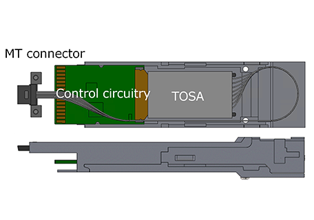 The mechanical size of the TOSA is as small as 22.5 × 13.0 × 4.0 mm, which allows to be built in any SFF (small form factor) potentially applied for an ELS. To be adopted to a blind mate ELS, the PMF cables attached to the TOSA should be draw back to the card edge and the length of PMF cables should be shorten for routing inside the housing. We developed an MT connector attachment technology to PMF (polarization maintain fiber) cables with the minimum length of 50 mm where the slow axis of the PMF cable can be aligned and fixed to an MT or SN®-MT connector(note ) with a rotational angular error of less than 2 degree. This TOSA can be built in a QSFP-DD housing together with a control circuitry mounted on a PCB assembly and an MT connector (Fig. 4), and also meet the requirements of fiber bending loss and PER (polarization extinction ratio). We launched the sample delivery of the TOSA and the commercialization has been scheduled in 2024.