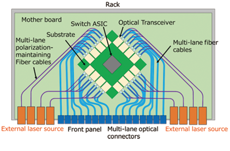 Data traffic has been increasing to support many kinds of IT services such as cloud services and 5G mobile networks. Hyperscale data centers that process big data and edge data centers that realize the low latency for Beyond 5G are faced with the challenge of expanding bandwidth and reducing the power consumption of a network switch server. Therefore, in order to save the power consumption and expand the bandwidth, it has been expected to adapt CPO as a new server architecture that performs photoelectric conversion in close proximity to an electronic device. CPO has a unique packaging structure where high-density silicon photonics transceivers are mounted together with a switch ASIC (application specific integrated circuit) on the same substrate. A wide bandwidth switch ASIC generates a large amount of heat. Hence, it derives temperature increase of the SiPh transceivers. It is difficult for compound semiconductor lasers to realize the required characteristics and guarantee the reliability in such a high temperature. Therefore, an ELS is proposed to operate lasers at a front panel which has an environmental condition of lower ambient temperature (Fig. 1). ELS (Fig. 2) integrates a number of lasers into a pluggable housing. And high optical output power and maximization of power conversion efficiency has been required.
