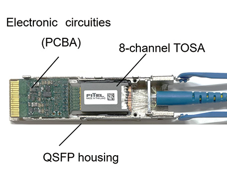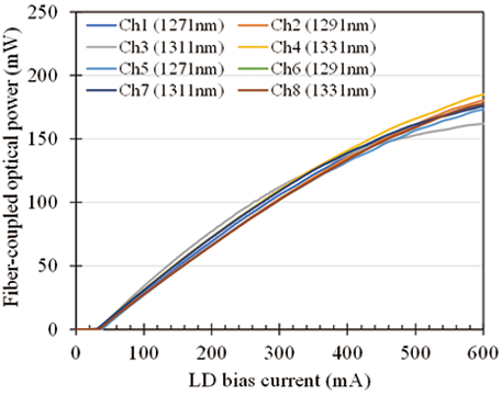 The developed ELS consists of a QSFP housing which has been standardized for an optical transceiver, an 8-channel TOSA (Transmitter Optical Sub-assembly), and electronic circuities to control TOSA (Fig. 3). The 8-channel TOSA integrates our high-power DFB (Distributed Feedback) LDs (Laser Diodes). In order to obtain high optical output power with an un-cooled laser structure, the optical coupling system was optimized to maximize the optical coupling efficiency and the heat dissipation structure of the TOSA was optimized to reduce an LD temperature. And This TOSA achieves a low LD bias current as low as 300 mA at a case temperature of 55 °C to realize the fiber-coupled power of 100 mW/ch with an uncooled operating condition (Fig.4).