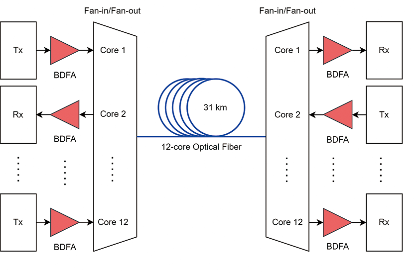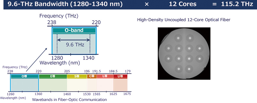 KDDI, KDDI Research, Sumitomo Electric, Furukawa Electric, and OFS have succeeded in experiments in high-capacity transmission with a transmission bandwidth of 115.2 THz by using the high-density uncoupled 12-core optical fiber with a coating diameter of 250 μm and combining it with O-band coherent DWDM transmission technology, which significantly reduces the effects of inter-core crosstalk.
