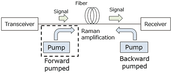 Raman amplification(note 1) is a supporting technology in optical fiber communication systems, and backward pumped Raman amplification, which amplifies optical signals from the receiver side, is used normally. There were high expectations for forward Raman units given the broad bandwidth of the optical output and low noise characteristics, but the development of a low noise optical pump source was an issue. In March 2023, we solved this issue with forward pumped Raman amplification (Fig. 1) and confirmed bidirectionally pumped Raman amplification with low noise amplification characteristics applicable for practical optical fiber communications systems (Fig. 2). The optical noise characteristics of the transmitted optical signal were low enough, we could expect better quality of the optical signals (Q factor, (note 2)).