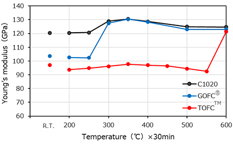 In addition to conventional oxygen-free copper (C1020), Furukawa Electric has been mass-producing GOFC®, a heat-resistant oxygen-free copper developed using proprietary materials design and manufacturing technologies that suppress crystal grain coarsening during high-temperature bonding. Furukawa Electric has now expanded its product lineup with the addition of TOFC™, a low-Young’s-modulus, heat-resistant oxygen-free copper. While maintaining high thermal conductivity, TOFC™ achieves excellent heat resistance without softening at high temperatures (Figure 1). As a result, TOFC™ maintains its stiffness even at temperatures above 300 °C, where soldering or resin bonding is performed, which is expected to reduce warpage and deformation. Additionally, TOFC™ exhibits a lower Young’s modulus than conventional oxygen-free copper at temperatures up to 600 °C (Figure 2, Table). This property helps suppress delamination at the bonded interfaces between materials with differing coefficients of thermal expansion, significantly enhancing connection reliability.