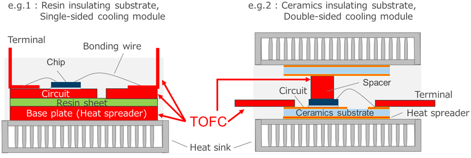 With these features, TOFC™ is well suited for applications such as heat spreaders and terminals in power semiconductor modules, as illustrated in the schematic cross-section (Figure 3). Furthermore, when applied to high-current busbars requiring high heat resistance, TOFC™ can suppress strength degradation during high-temperature operation compared with conventional oxygen-free copper and tough-pitch copper. These advantages make TOFC™ suitable for broader applications of TOFC™ in areas such as renewable energy inverters and xEV power control units.