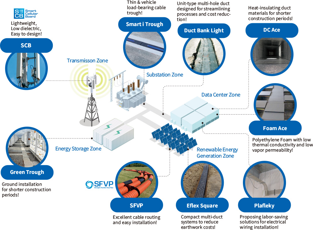 Speed is everything in data center construction - from planning to launch. These projects come with significant challenges: securing large plots of land, navigating property acquisition issues in surrounding communities, and addressing ground stability and disaster risks to ensure reliable operation. Furukawa Electric's functional plastics products deliver outstanding ease of installation, enabling significant labor savings and shorter construction timelines. Even when delays occur in other phases of a project, the time saved through our products helps absorb those setbacks - reducing the risk of overall schedule overruns.