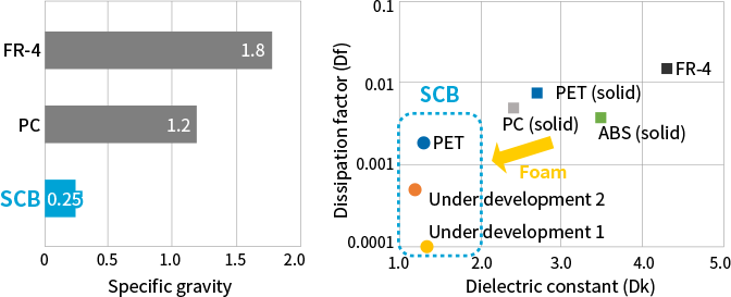 Smart Cellular Board (hereinafter “SCB”) is a cellular foamed, board type low dielectric material. Using our original foaming technology, it is possible to foam highly heat resistant plastics such as engineering plastic and super engineering plastic and obtain even lower dielectric properties than are achievable with typical low dielectric plastics.