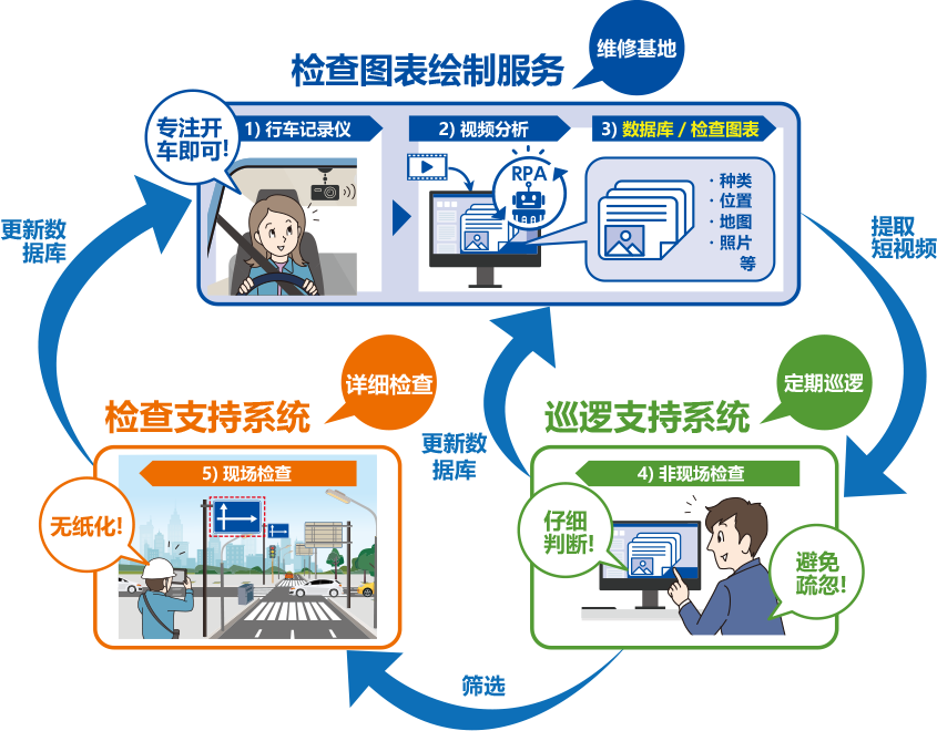 - 路边设备检查图表绘制服务采用独创的机器人过程自动化(RPA)系统,通过行车记录仪视频识别设备的种类和位置,形成正式的检查图表作为设备数字数据库。