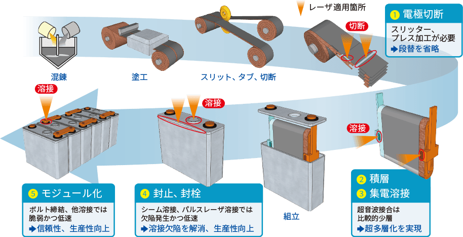 当社のレーザ加工ソリューションが、リチウムイオン電池製造工程における課題を早期に解決し、生産性向上、コストダウンへ大きく貢献します。