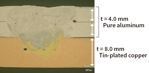 - Blowhole (cavities inside welded sections) formation is suppressed and high-reliability welding is realized even for the welding of the dissimilar materials aluminum and copper.