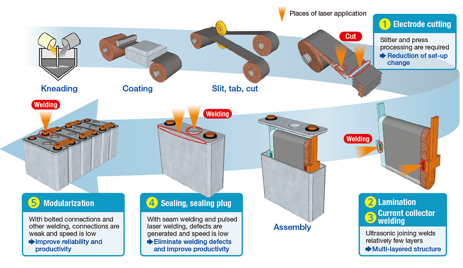 Furukawa Electric's laser processing solutions are able to quickly resolve issues in the lithium-ion battery manufacturing process, contributing significantly to productivity improvements and cost reductions.