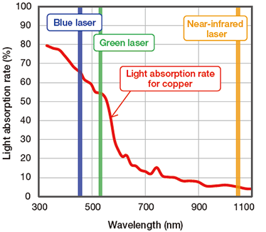 The following graph shows the light absorption rate of copper with respect to laser wavelength, with the horizontal axis representing the laser wavelength, and the vertical axis representing the light absorption rate of copper. When using a near infrared fiber laser on its own, the light absorption rate is approximately 4%, which requires the input of laser power with high energy density. However, this makes it difficult to achieve stable heat input, resulting in processing defects such as spattering and blowholes.
