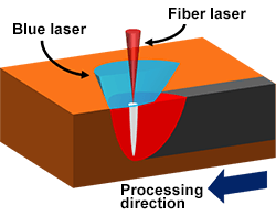 Furukawa Electric's Blue-IR hybrid laser is a hybrid laser by combination of a high-power blue oscillator equipped with a blue direct diode laser jointly developed with NICHIA CORPORATION and a near infrared (IR) fiber laser.