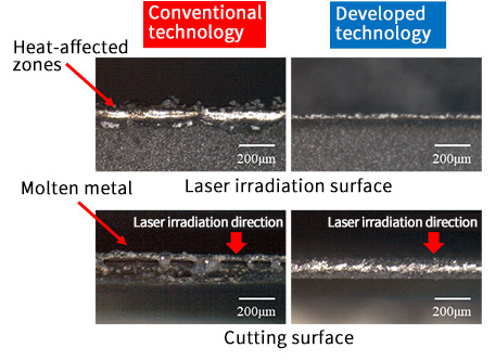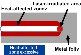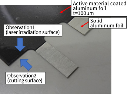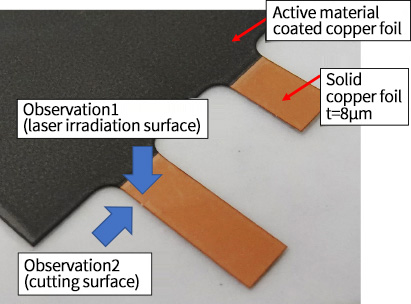 Laser processing was performed on cathode and anode foil for lithium ions manufactured by The Furukawa Battery Co., Ltd. The heat-affected zone was found to have decreased when compared with the results obtained with conventional fiber laser processing.