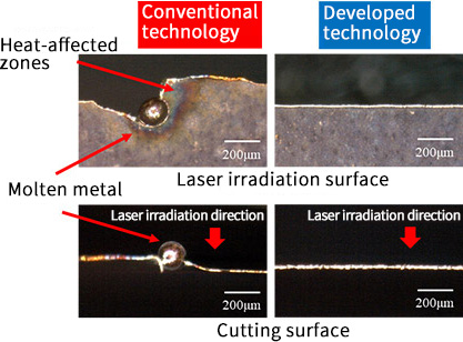 - With continuous wave lasers, on the other hand, molten material is deposited on the cutting surface, and heat-affected zones occur on the surface due to the excessive heat input.