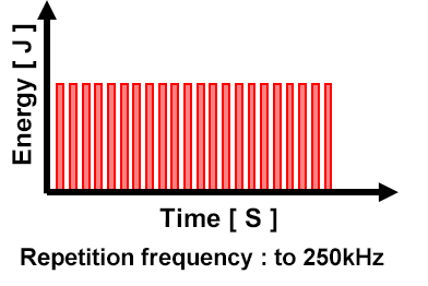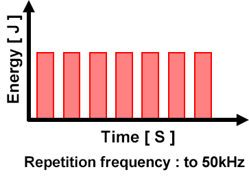 - With conventional laser pulse waveform control, repetition frequency is limited to 50 kHz or lower, and pulses do not overlap when performing high-speed processing.