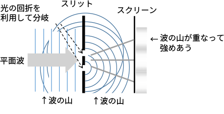 平面波がスリットを通ると回折が起きてスクリーン上で波の山が重なって強めあい、白いところが分岐した光となります。