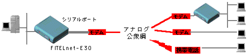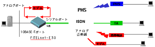 | FITELnet-E30のシリアルポートにモデムを接続し,さらにモデムのアナログポートとFITELnet-E30のアナログポートを接続することで,ルータのみならずPHS(PIAFS32kbps/64kbps,α DATA)や携帯電話,TA,モデムなどからのアクセスも実行できます。 | |