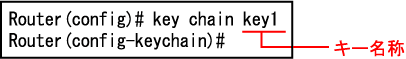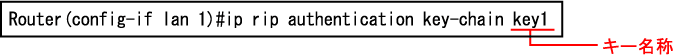 key-chainの設定は、キー名称を指定して行ないます。key-chainモードで、キーの情報を設定し、各インタフェースのRIP2に関する設定で、使用するキー名称を指定します。