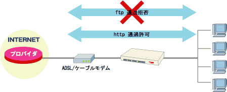 FITELnet-F1000では、ADSLやケーブルテレビインターネットの常時接続回線を利用するため、IPパケットフィルタリングを利用して、不正なアクセスを中継しないようにする必要があります。