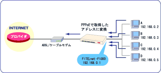 NAT+では、複数のLAN端末を、1つのアドレスに変換して通信します。この機能により、ADSL/ケーブルテレビインターネットに、複数のパソコンから接続することができます