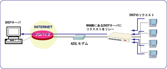LAN 上のDHCP クライアントからの要求を、WAN 側にリレーし、WAN 側のDHCPサーバから割り当ててもらう機能です。