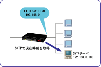 FITELnet-F120は、外部のSNTPサーバから現在時刻を取得することができます。SNTPサーバとしては動作しません。