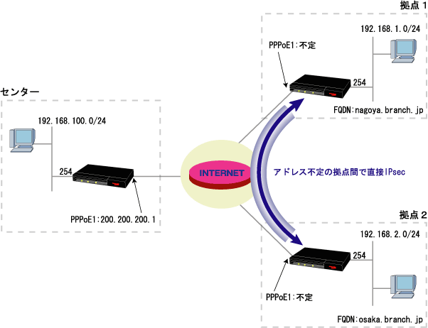 ダイナミックDNS機能を使用して、アドレス不定の拠点間で直接IPsec通信を行なう。