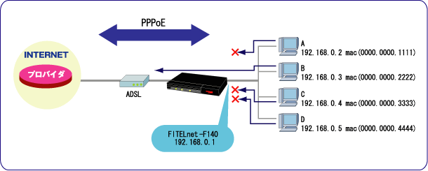 MACアドレス(0000.0000.2222)からのパケットのみ中継するという形態を考えます。