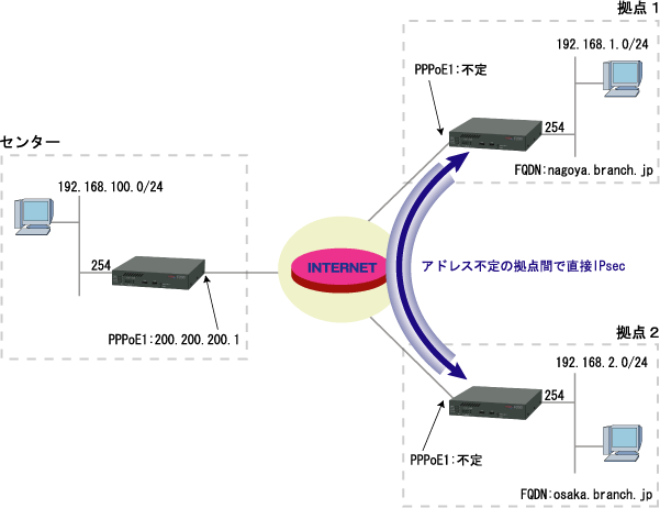 ダイナミックDNS機能を使用して、アドレス不定の拠点間で直接IPsec通信を行なう。