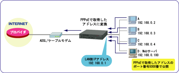 ここでは、ローカルにあるWebサーバ(192.168.0.100)を、ポート番号5000で公開する方法についても考慮しています。