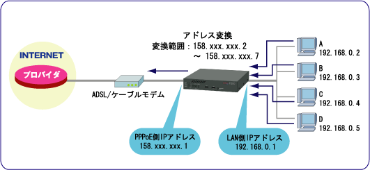 変換後のアドレス範囲:158.0.0.1〜158.0.0.7