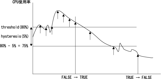 FALSE状態では2秒間隔で監視。5回連続でCPU使用率が80%以上の場合にTRUEに遷移します。
