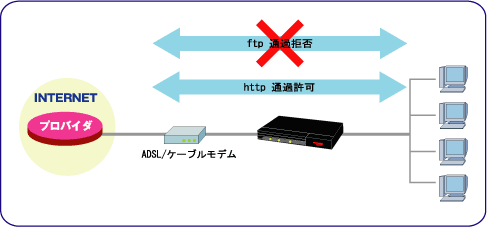 FITELnet F2000では、ADSLやケーブルテレビインターネットの常時接続回線を利用するため、IPパケットフィルタリングを利用して、不正なアクセスを中継しないようにする必要があります。